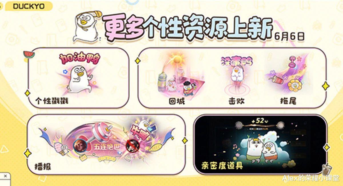 活动时间6月6日-8月6日,传说播报-小牛鸭首周230点券,个性表情-小刘鸭首周78点券,亲密度道具-开心鸭礼包20点券,个性戳戳-加油鸭10点券。