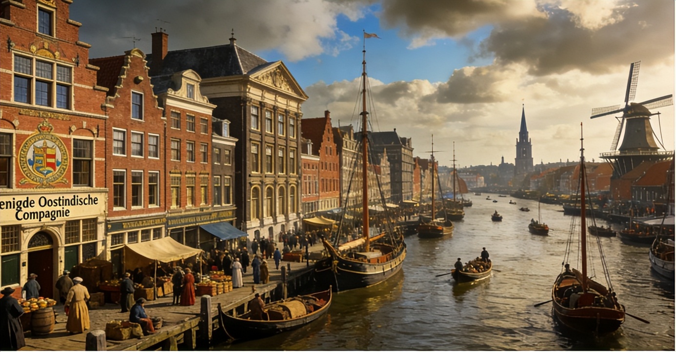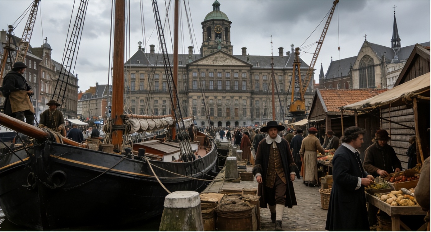 17世纪是荷兰的黄金时代。这个国土面积比中国一个省还小的国家,凭借无与伦比的航海技术和商业头脑,愣是在全球各大洋上建起了一张贸易网络。鼎盛时期,荷兰拥有超过16000艘商船,荷兰东印度公司(VOC)的触角从日本长崎伸到南非开普敦,从印度尼西亚的爪哇岛延伸到北美的曼哈顿岛。阿姆斯特丹的交易所每天人声鼎沸,整个欧洲的信贷和资本都向这里汇聚,荷兰盾一度成为那个时代的"美元"。