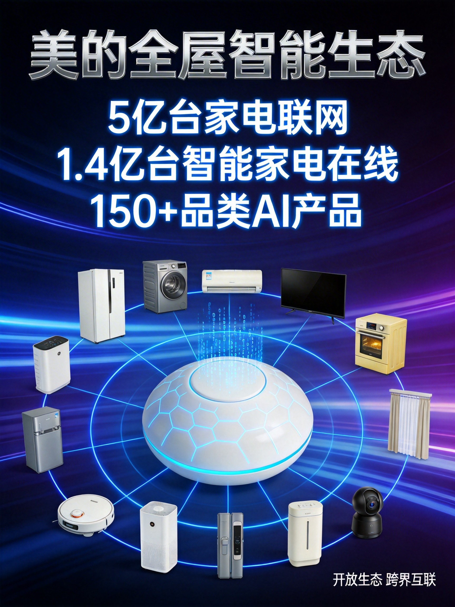 连接能力:5亿台家电设备已具备联网能力 在线规模:1.4亿台智能家电实时在线 品类覆盖:150+家电品类实现AI化