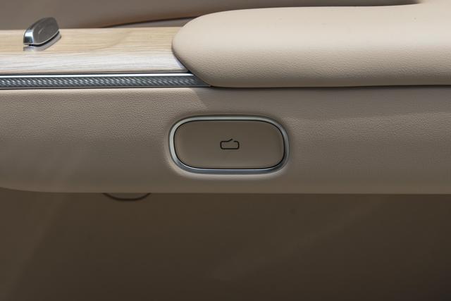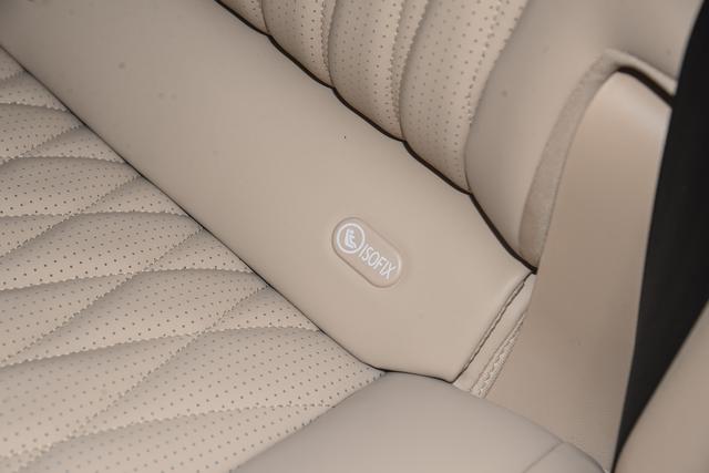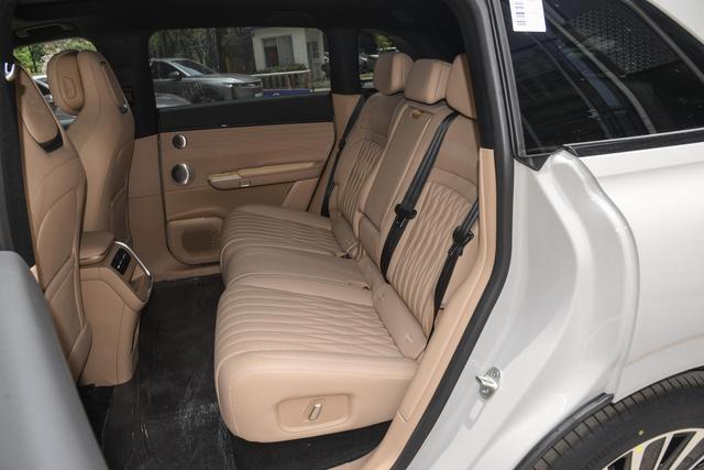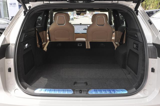 得益于 3000mm 的轴距设定,星纪元 ET 内部乘坐和储物空间表现充裕。根据官方数据,其座舱有效空间达到了 3.45 立方米,这一数值大于奔驰 EQS SUV 的 3.3 立方米和特斯拉 Model X 的 3.2 立方米。在标准的五座状态下,后排乘客的腿部空间可达 1020mm,并且座椅本身支持前后 180mm 的滑动范围以及最大 130° 的靠背角度调节,为不同身材的乘客或长途乘坐提供了调整坐姿的灵活性。座椅材质选用了 Nuprima 微绒感皮质,触感比较细腻,内部填充物软硬度适中,并且座垫和靠背表面有打孔处理以增强透气性。厂家资料显示座椅骨架经过了 20 万次的耐久性测试。储物能力方面,后备箱在常规状态下容积为 546 升,将后排座椅放倒后可以形成一个更大的载物平台,最大容积扩展至 1835 升,足以容纳例如 5 个 28 英寸的行李箱。车内细节设计还包括带密码锁功能的电动手套箱和可前后移动的中岛地台(官方称“星动吧台”),后者集成了手机无线充电板和杯架加热/制冷功能。