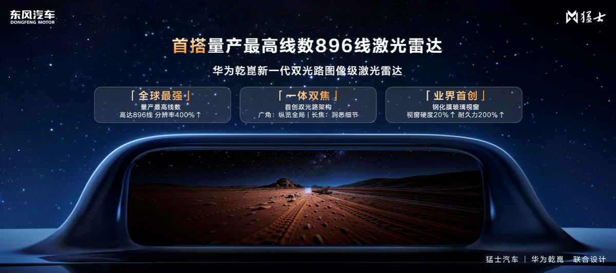 作为越野赛道的唯一全栈合作伙伴,华为乾崑更为猛士汽车注入了最强智能。猛士汽车实现越野车首搭华为乾崑896线新一代双光路图像级激光雷达,能稳定探测120米、14厘米高的障碍物,大幅提升出行安全。华为乾崑智驾® ADS 5也将首批搭载在猛士车型上,包括全维防碰撞CAS 5.0、车位到车位3.0,打造更安全、更舒适的驾驶体验。