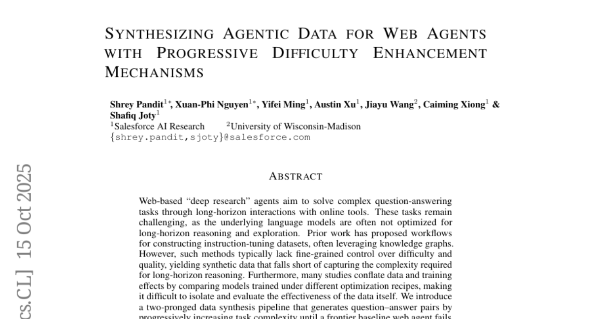 在人工智能快速发展的今天,我们经常听说各种智能助手能够在网上搜索信息、回答复杂问题。但你是否想过,这些AI助手是如何学会处理那些需要多步骤推理、涉及复杂信息搜索的问题的?最近,Salesforce AI Research团队的研究人员Shrey Pandit、Xuan-Phi Nguyen、Yifei Ming等人发表了一项重要研究,提出了一种名为"ProgSearch"的创新数据合成方法。这项研究于2025年1月发表在arXiv预印本平台上,论文编号为arXiv:2510.13913v1,为训练更强大的网络AI助手提供了新的解决方案。