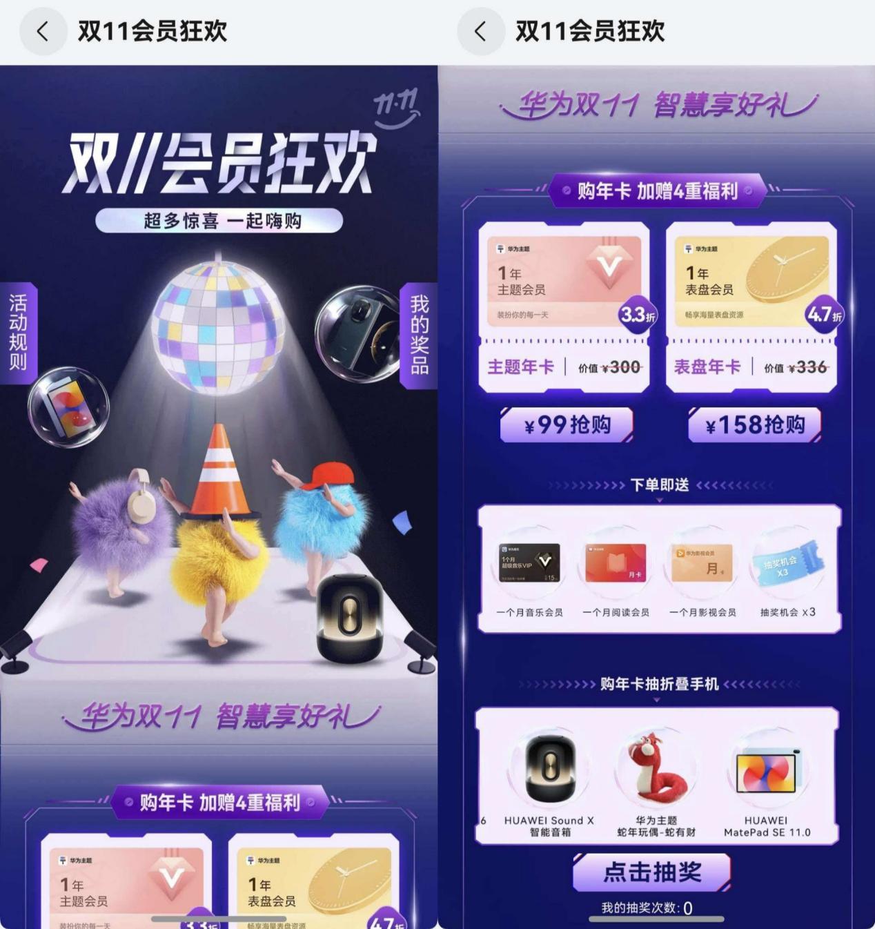 玩的正上头,5分钟的试用时间转瞬即逝,正意犹未尽的时候,突然发现双十一主题会员居然在做活动,这不是瞌睡送来了枕头嘛!看了一下,主题会员年卡买1赠4,直接附赠音乐、阅读、影视三大会员各一个月,真是娱乐生活一步到位。还有3次抽奖机会,奖品里居然有平板和折叠屏手机?更好玩的是1元抽盲盒活动,没准花1块钱一个月主题会员就到手了呢?真的是超有“快乐性价比”。