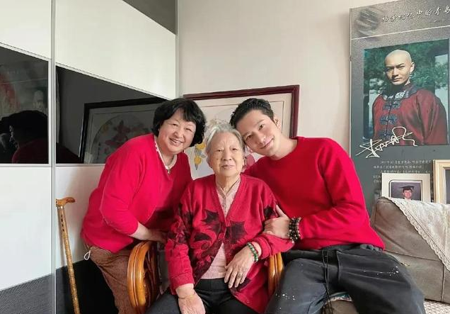 照片里的黄晓明,还有妈妈和姥姥,都穿上了喜庆的红色外套,画面十分的温馨