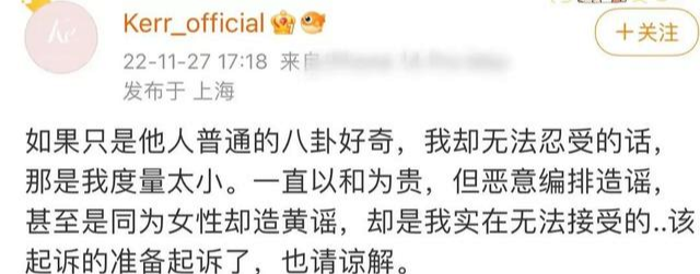 不过,11月27日,叶珂突然发文怒斥那些造谣者,称她正在准备资料起诉这些人。同时,叶珂还否认了黄晓明身边的人是自己,疑似间接性否认这段恋情。