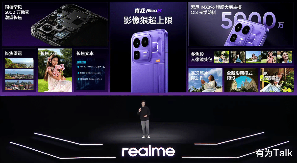 影像方面,真我Neo8打破性能机"扫码机"魔咒,搭载同档唯一50MP超光影潜望长焦,支持3.5倍光学变焦、7倍无损变焦与120倍超清变焦。针对学生群体打造的"拍课件神器"功能,通过AI文本超清、自动矫正、去反光三大技术,确保后排拍摄课件清晰可读,支持一键导出PDF格式。主摄采用1/1.56"索尼IMX896传感器,支持8K直出与多焦段人像拍摄,满足日常创作需求。