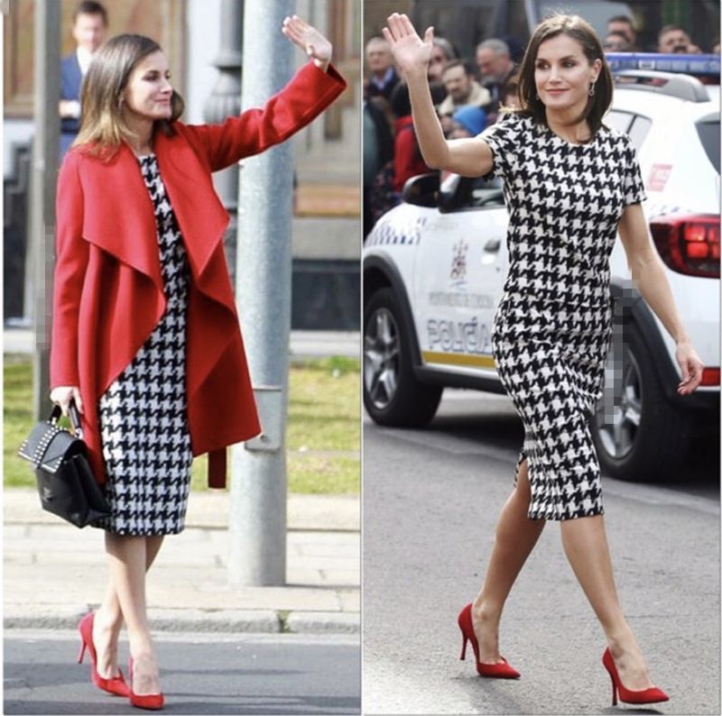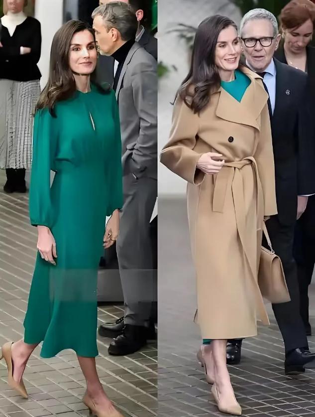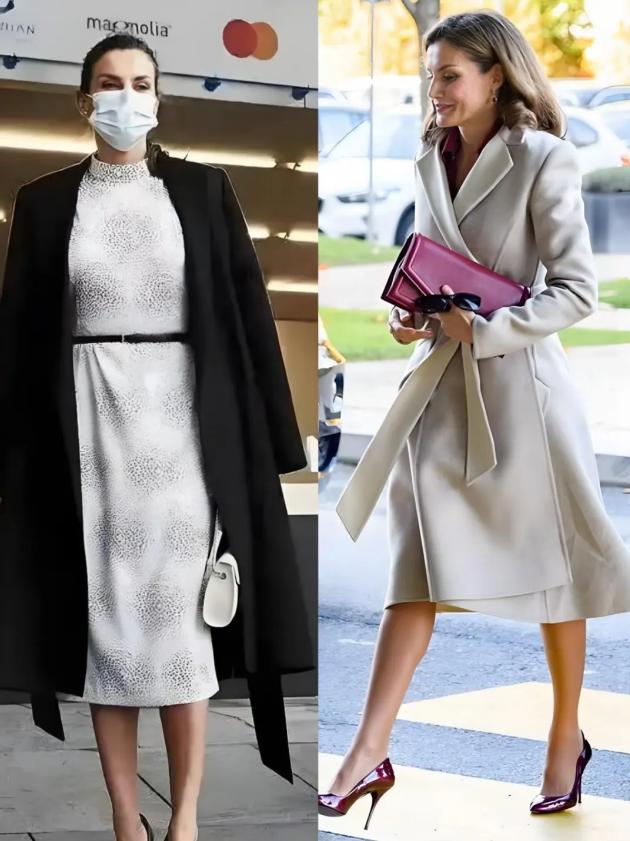在穿大衣的时候,莱蒂齐亚从不用短裙博眼球,她的裙装永远精准落在膝盖下方5-10厘米处,既不拖沓也不暴露。直筒款、A字款是她的偏爱,面料多选用羊毛、真丝混纺等自带质感的材质,一看就很高级。