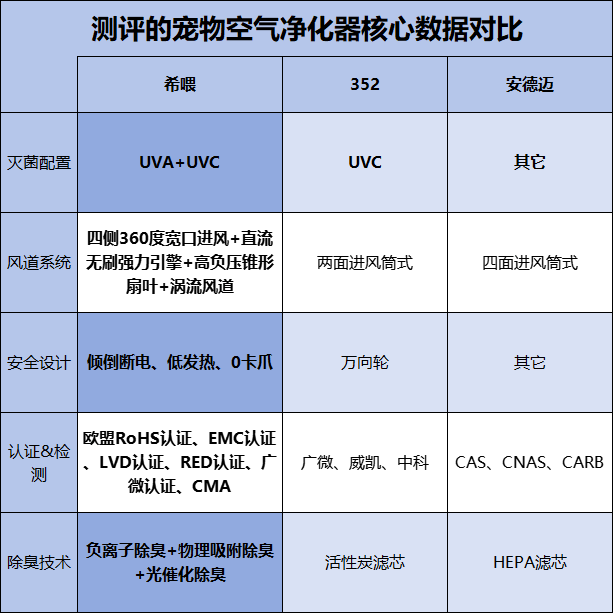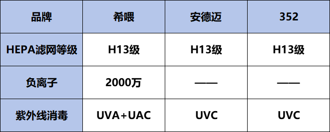 三款产品均配备 H13 HEPA 滤网,但希喂在此基础上加入 UVA+UVC 双波段紫外线与 2000 万级负离子系统,能高效灭杀常见细菌与过敏源,空气清洁度提升明显。352 采用 UV-C 紫外线,灭菌效果中等;安德迈无负离子功能,仅依靠紫外灯照射,作用范围有限。