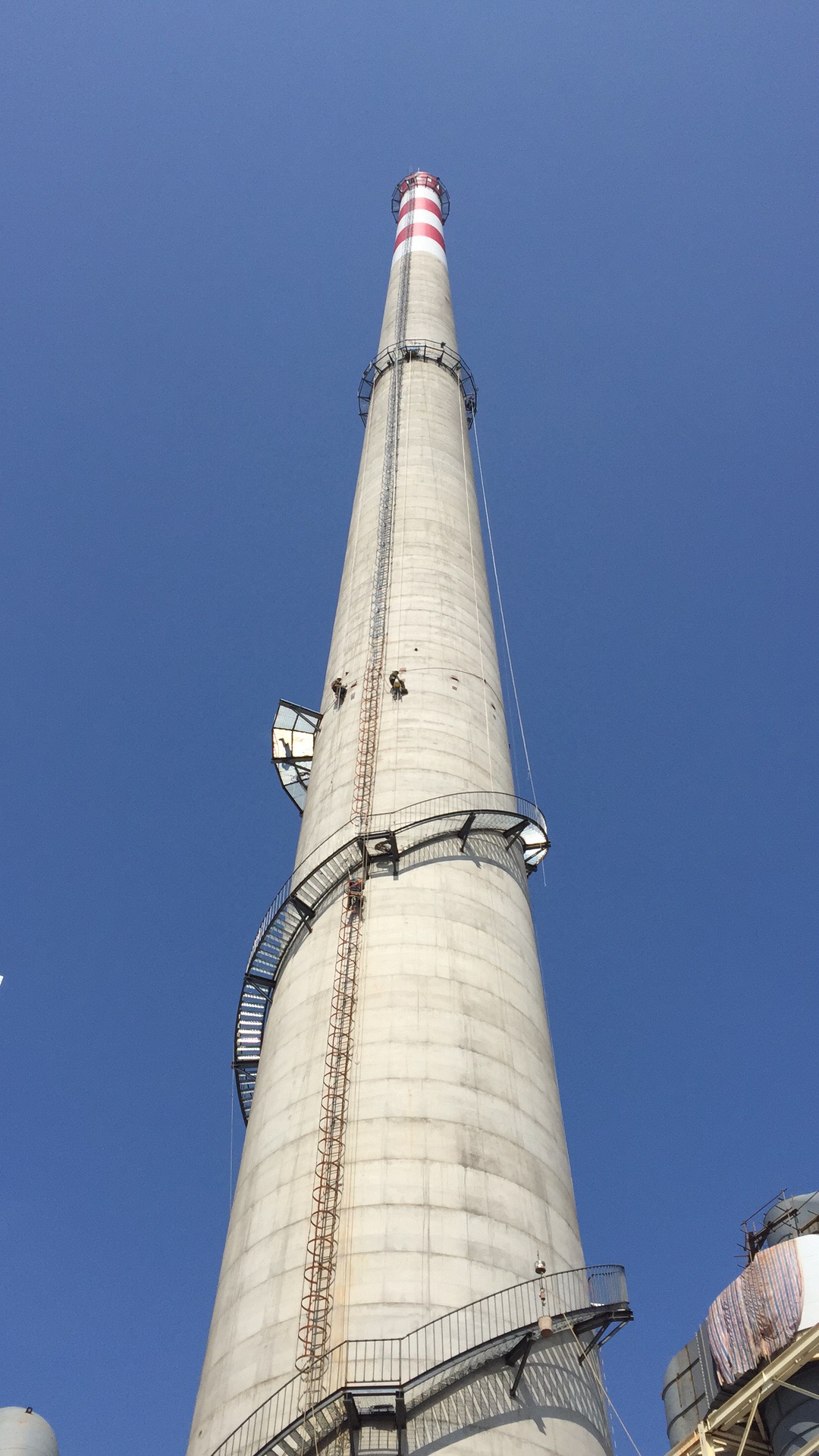2.防坠生命线安装:沿楼梯外侧全程安装防坠生命线(不锈钢钢丝绳),生命线两端与烟囱筒壁牢固固定,中间设置固定支架,间距≤3 米,确保作业人员可全程挂设防坠器。
