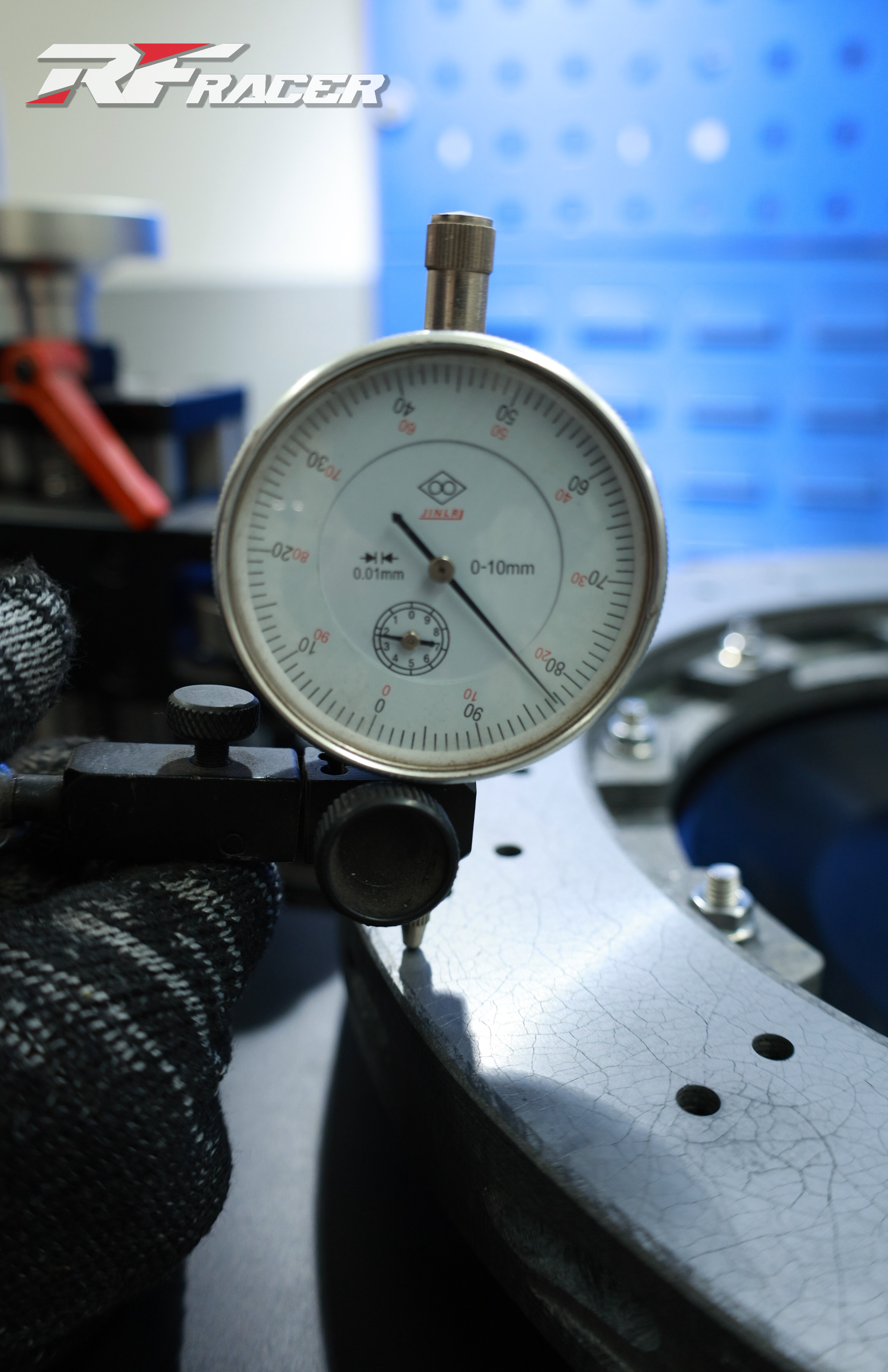 第二条红线:跳动量测量(Run-out Measurement) 刹车盘装上去只是第一步。专业的技师会拿出百分表(Dial Indicator),测量盘体旋转时的端面跳动量。 这是微米级的较量。如果轴头没有清理干净,哪怕夹杂了一粒铁锈或沙尘,都会在高速刹车时被放大成剧烈的方向盘抖动。