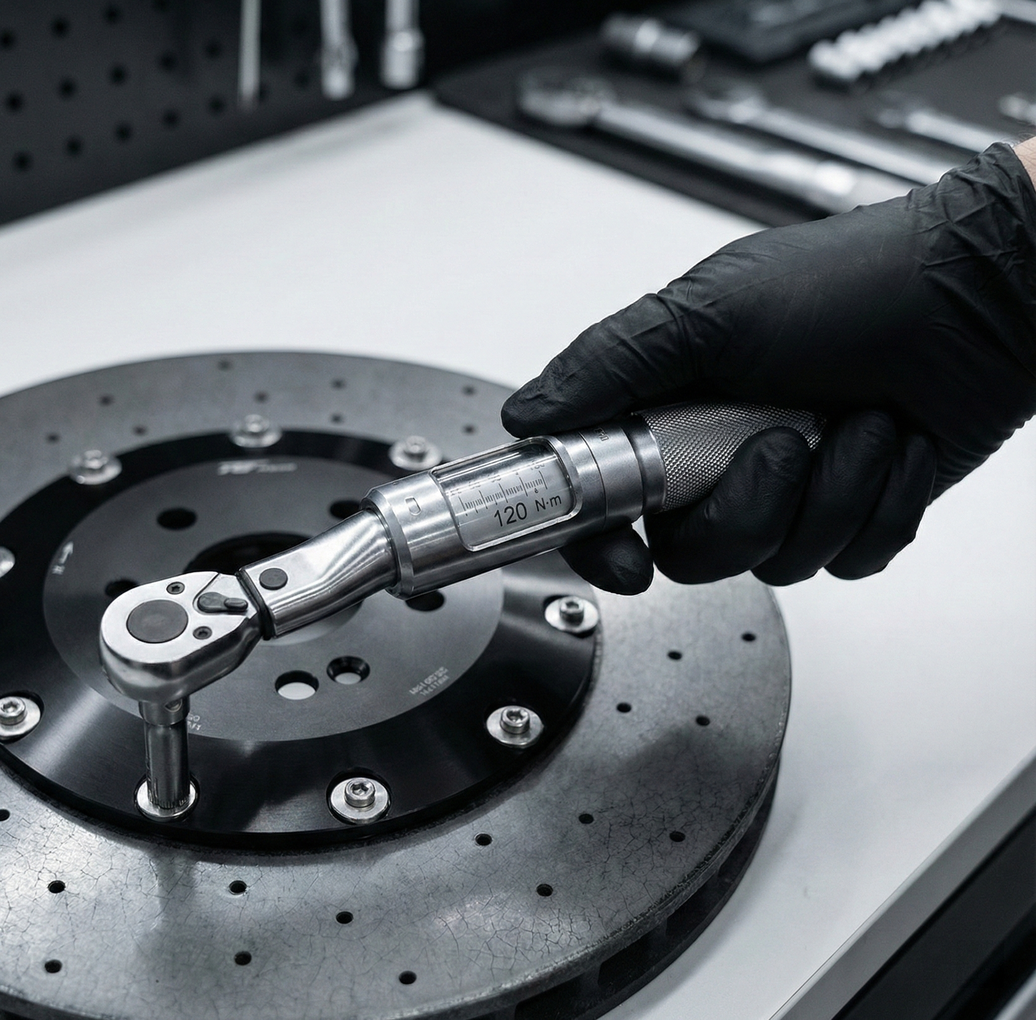 第一条红线:扭力管理(Torque Control) 很多非专业技师喜欢用风炮直接锁死轮毂螺丝。这是一个致命的错误。过大或不均匀的扭力,会直接导致合头与盘体产生肉眼不可见的应力变形。 在 RF 的标准流程中,必须使用扭力扳手,严格按照厂家规定的牛顿米(N·m)数值,进行对角线分级锁紧。