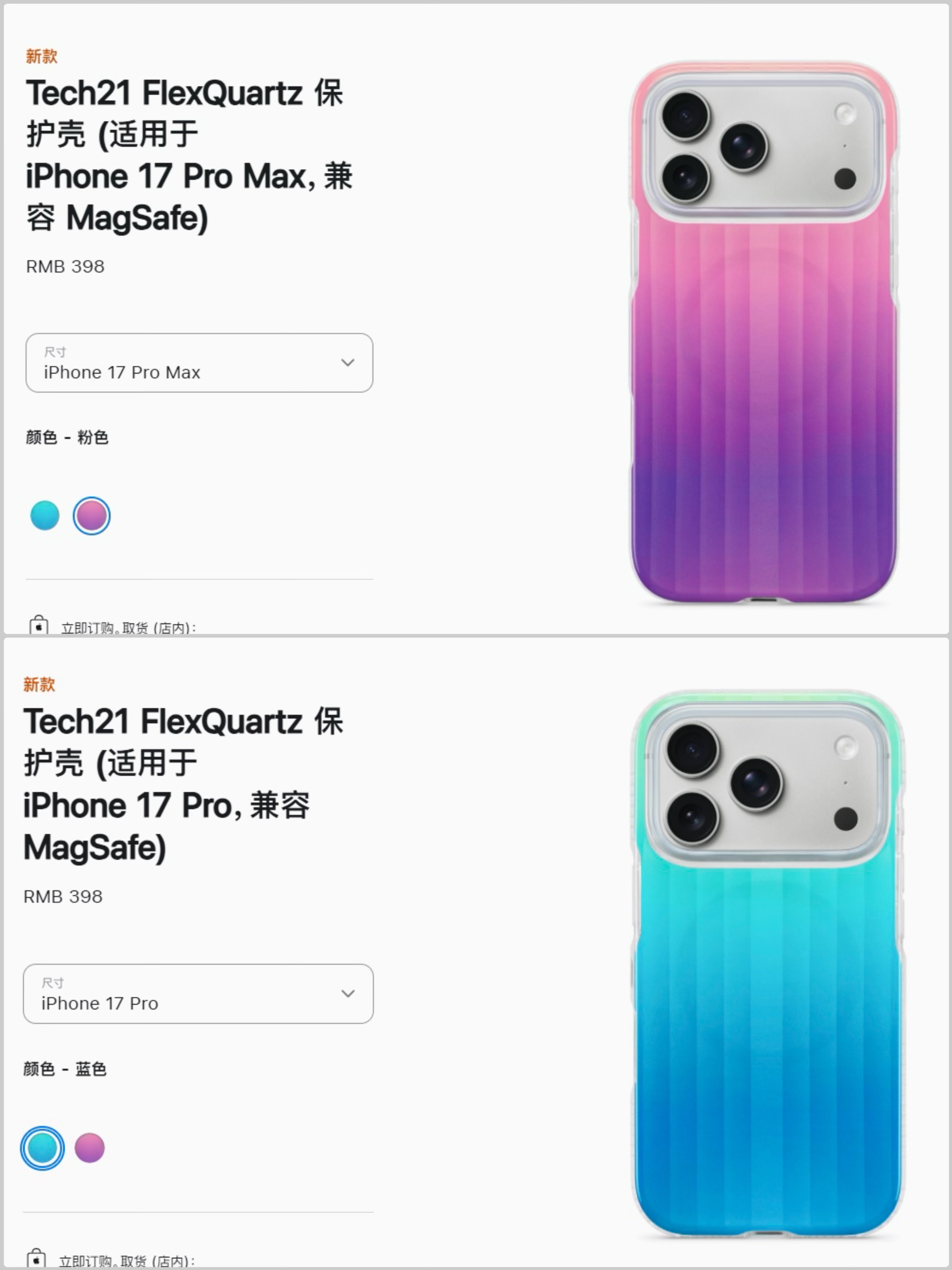 Tech21 FlexQuartz 保护壳这款保护壳提供了粉/蓝这两款配色,且均为渐变色;采用FlexShock™材料制成,官方号称可提供4.9米处多次跌落冲击防护;保护壳支持MagSafe功能,国行售价398元。