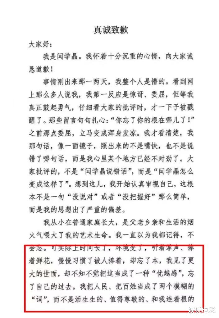 闫学晶深夜在朋友圈道歉,表示心情十分沉重,向大家诚恳道歉。闫学晶没有解释,更多是自我剖析,看来她可能得到高人指点。
