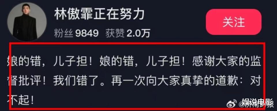林傲霏随着闫学晶的道歉,他也在社交账号发文道歉,表示娘的错,儿子担!感谢大家的监督批评,他们错了,再一次向大家真挚的道歉,对不起!