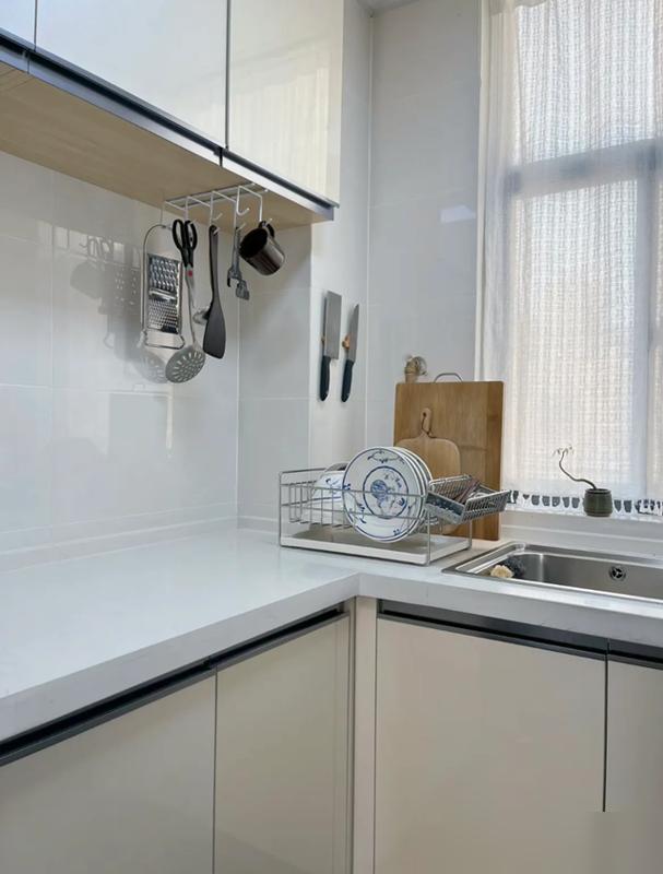 厨房大单槽配抽拉龙头,炒菜锅也能横着冲;玄关薄柜只做40厘米深,常穿外套和钥匙各归其位;连儿童区都只用同色系收纳盒,五颜六塑胶玩具装进去立马顺眼。