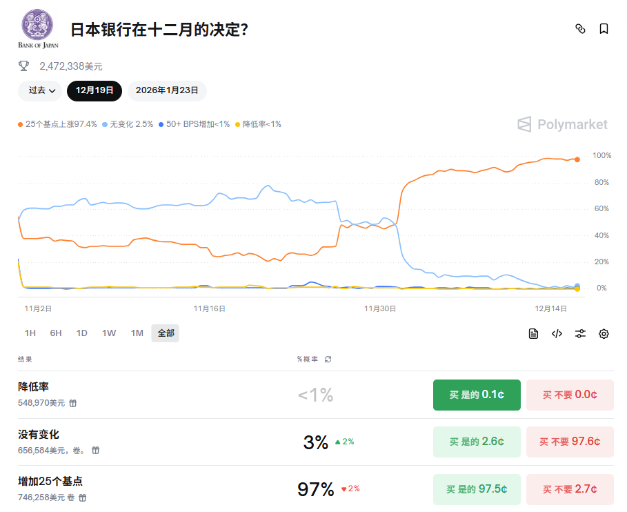 最大的变数可能来自小日子央行加息。据日经中文网消息,小日子央行12月18日—19日将召开金融政策决定会议,上调目前为0.5%的政策利率。最可能的方案是加息0.25%至0.75%。另外,小日子央行最早将于1月开始出售ETF持仓。现在小日子加息的概率已经到了97%: