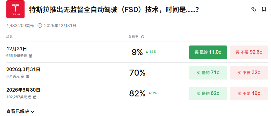 这次是准入,有点不一样了,以前自动驾驶别管怎么吹,出了问题依然是驾驶员的问题。现在是车子只要在规定路段、规定速度下使用了这个功能,出了事故,如果不是人为干预,那就是车企或者运营方的问题了。说白了,L2到L3是整个行业进入商业化应该的关键一步。特斯拉那边也有新进程了,现在市场预计26年3月31日的概率在70%,6月30日的概率在82%: