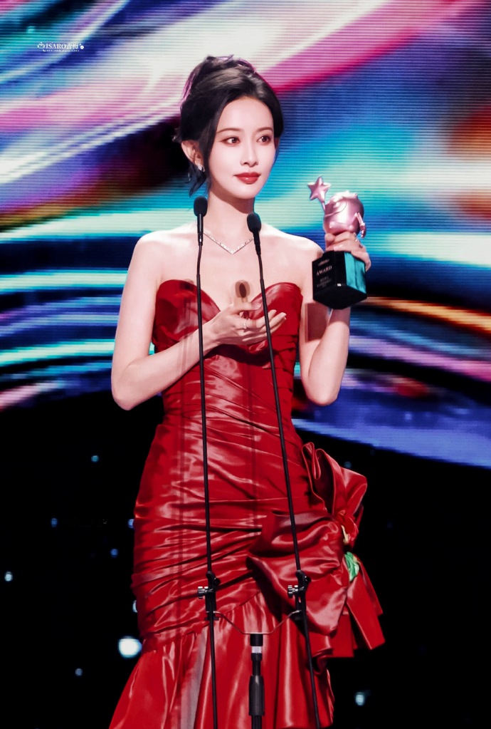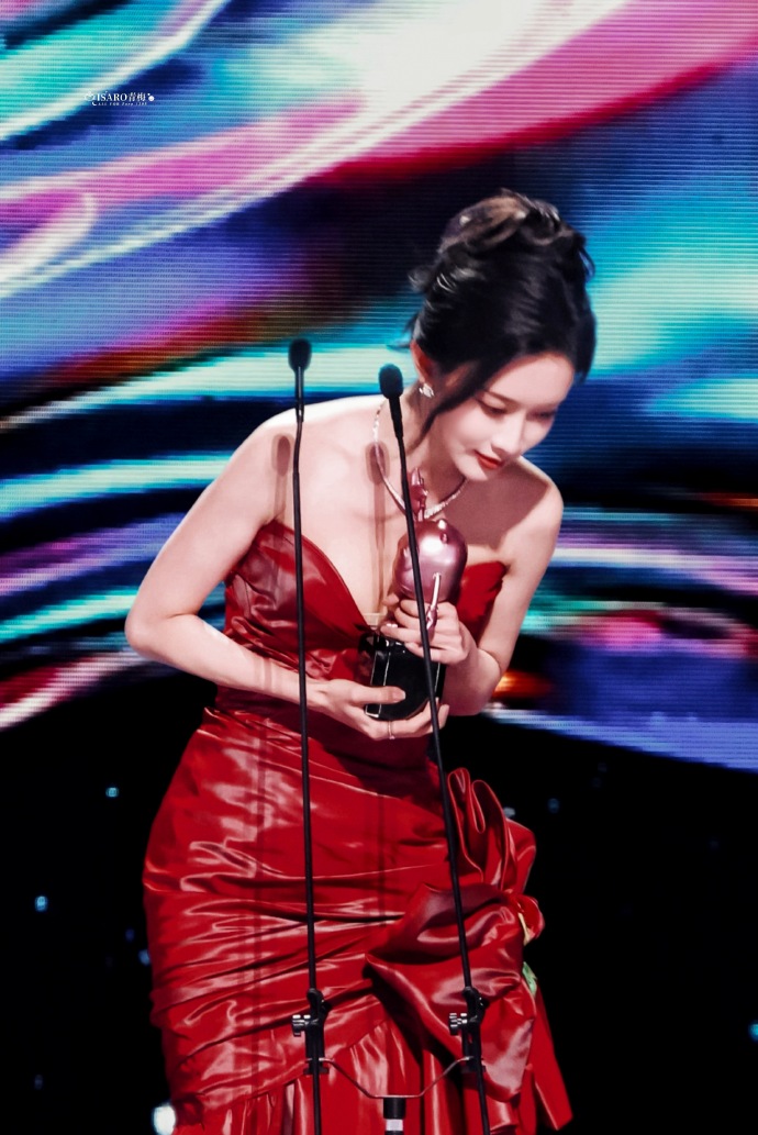 这套造型的妙处,是 “艳而不媚、奢而不重”:红裙是她的气场底色,松弛的神态是藏在热烈里的柔,往舞台上一站,就把 “明艳与松弛” 揉成了独一份的风格。原来领奖造型的惊艳,从不是礼服的堆砌,是她抬步间漫出来的底气,让每一寸红都成了她的专属高光。