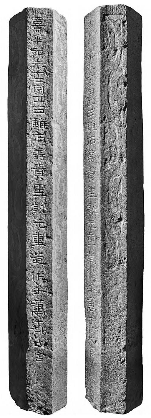 本次征集的四块画像石,材质均为当地的红褐色砂质页岩,采用浅剔地平铲的雕刻技法,只刻出物象的外部轮廓,内部细节不用阴线刻划,而多以墨线勾绘,部分位置施黑彩。其中4号画像石石柱,高116厘米,横断面呈六边形,边长9.2厘米。正面阴刻汉隶“熹平元年十二月四日离石寿贵里韩元重造作千万卋(世)之舍”,其余五面刻绘卷云纹。石柱顶端凸起一圆形榫头,以榫卯形式与上方的方形栌斗石相接。栌斗石高16厘米,八面均刻绘卷云纹,每面以朱彩描绘边界。