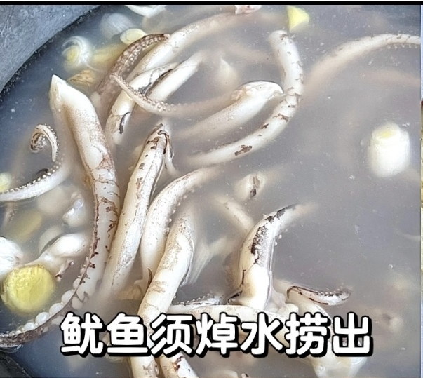 一切准备就绪,就可以开始烹饪了。第一步焯水去腥至关重要,锅中加入足量清水,放入几片姜片、一段葱段,再倒入少许料酒,大火将水烧开。水开后放入处理好的鱿鱼须,焯水时间不用太长,1到2分钟即可,看到鱿鱼须微微变色、卷起就立刻捞出,用清水冲去表面的浮沫,沥干水分备用。这一步千万不能煮太久,否则鱿鱼须会变得老韧,失去脆嫩的口感。