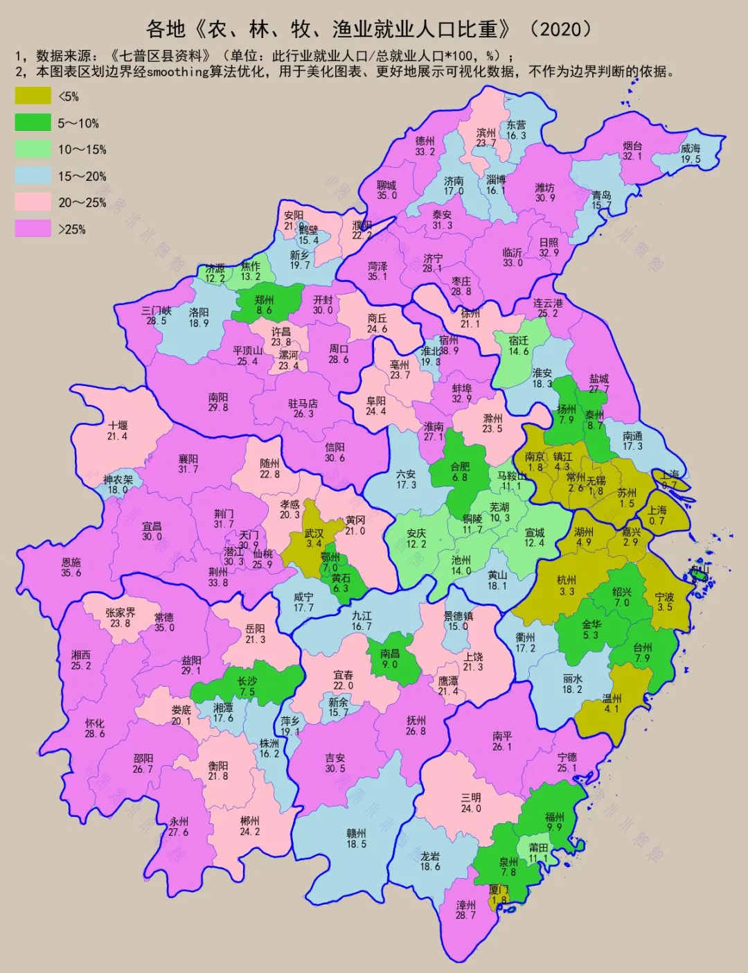 华东地区情况更为多样。山东作为农业大省,不少城市如聊城、菏泽等比重较高,体现其农业大市的底蕴。