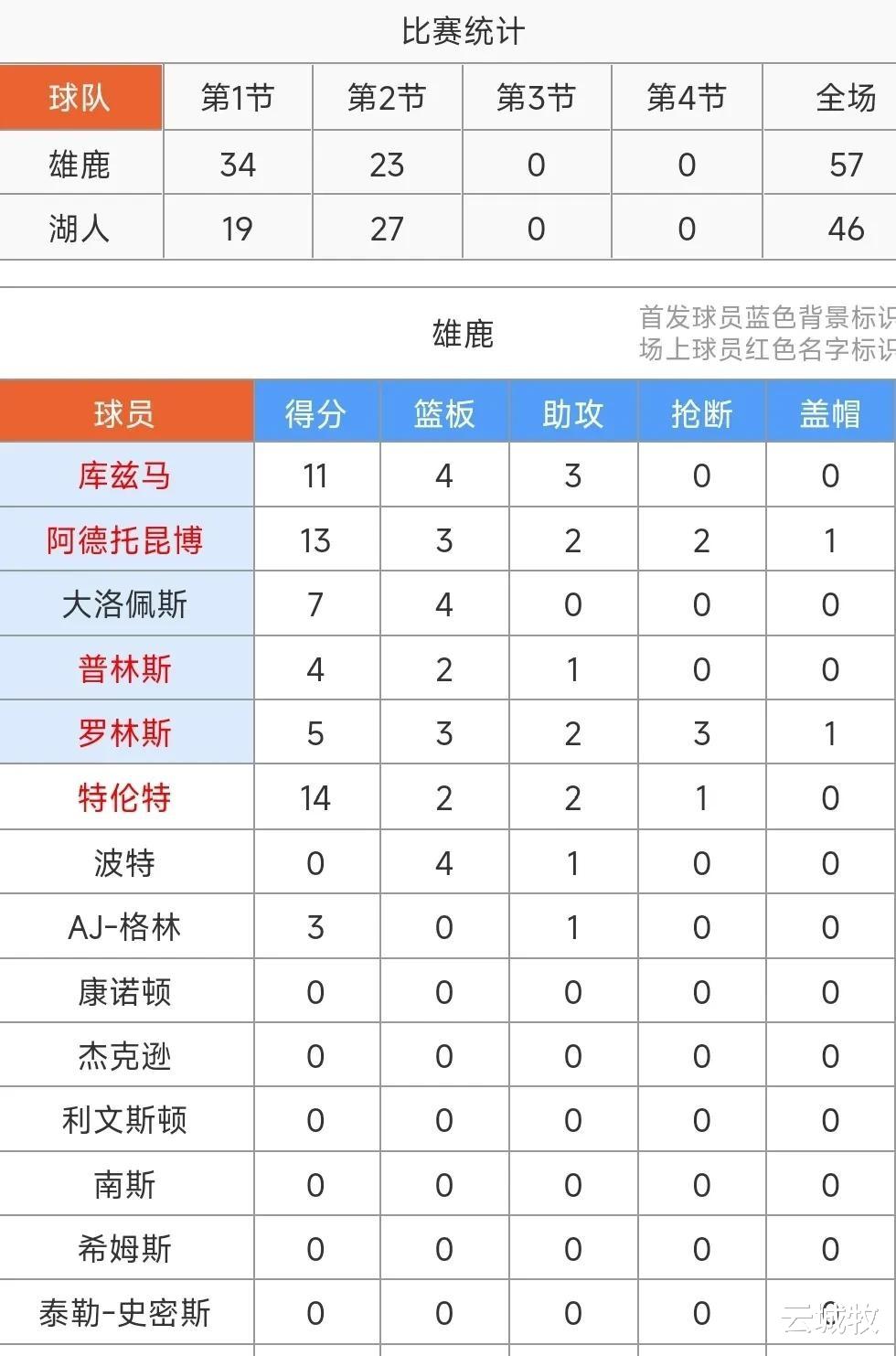 第二节比赛,雄鹿队继续保持领先优势,半场结束时以57-46领先湖人队。湖人队的进攻效率低下,投篮命中率偏低,多次出现失误,给了雄鹿队许多轻松得分的机会。