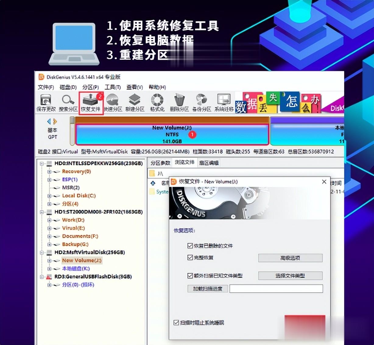 在尝试修复之前,建议先用专业数据恢复软件扫描硬盘,导出重要文件。在PE环境中,可使用DiskGenius导出数据: