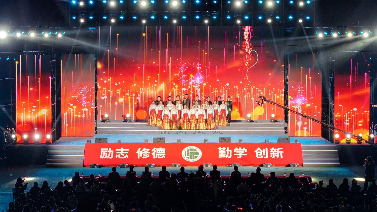 开场合唱《我爱你中国》在校艺术团合唱队的演绎下气势恢宏,歌声从雪域高原唱到江南水乡,将对祖国的深情礼赞融入每一个音符,瞬间点燃全场爱国热情。