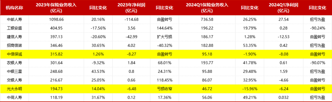 《险企高参》统计10家银行系险企2024一季度偿付能力报告发现,仅中信保诚和光大永明保费收入是负增长,同时净利润也由盈转亏。堪称“难兄难弟”。