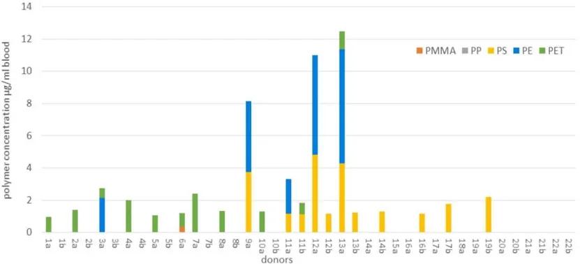 这项研究首次测量到人体血液中塑料聚合物成分的质量浓度:尽管样本量较小,但血液中可定量塑料颗粒总浓度的平均值为 1.6µg/ml。研究在血液中鉴定,并定量了四种塑料中常用的高产量聚合物。