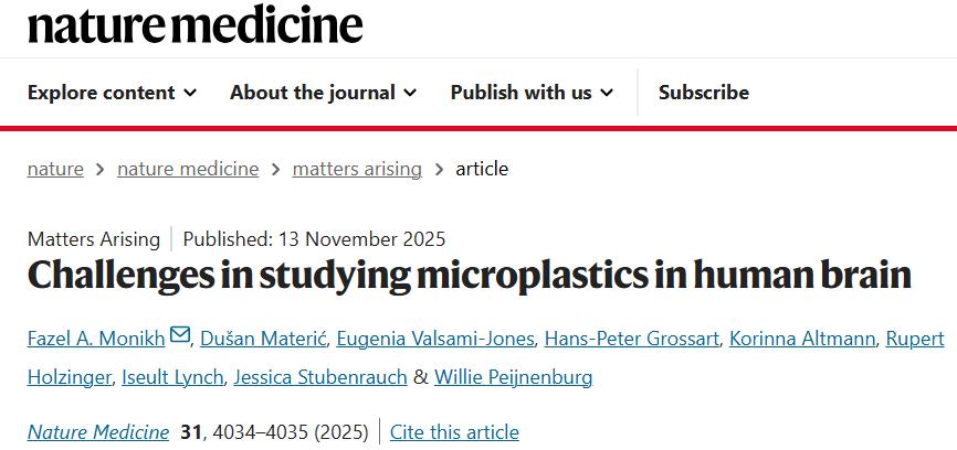 2025 年 11 月,Nature Medicine 发表了一份质疑信 [5],直接指出对上述研究 [4] 在方法方面的疑问。例如,污染控制有限和缺乏验证步骤,这些可能影响数据的可靠性。他们重点阐述了相关方法学上的局限性,这对于推进人体生物监测研究中 MNP 检测的稳健性和可重复性具有普遍意义。