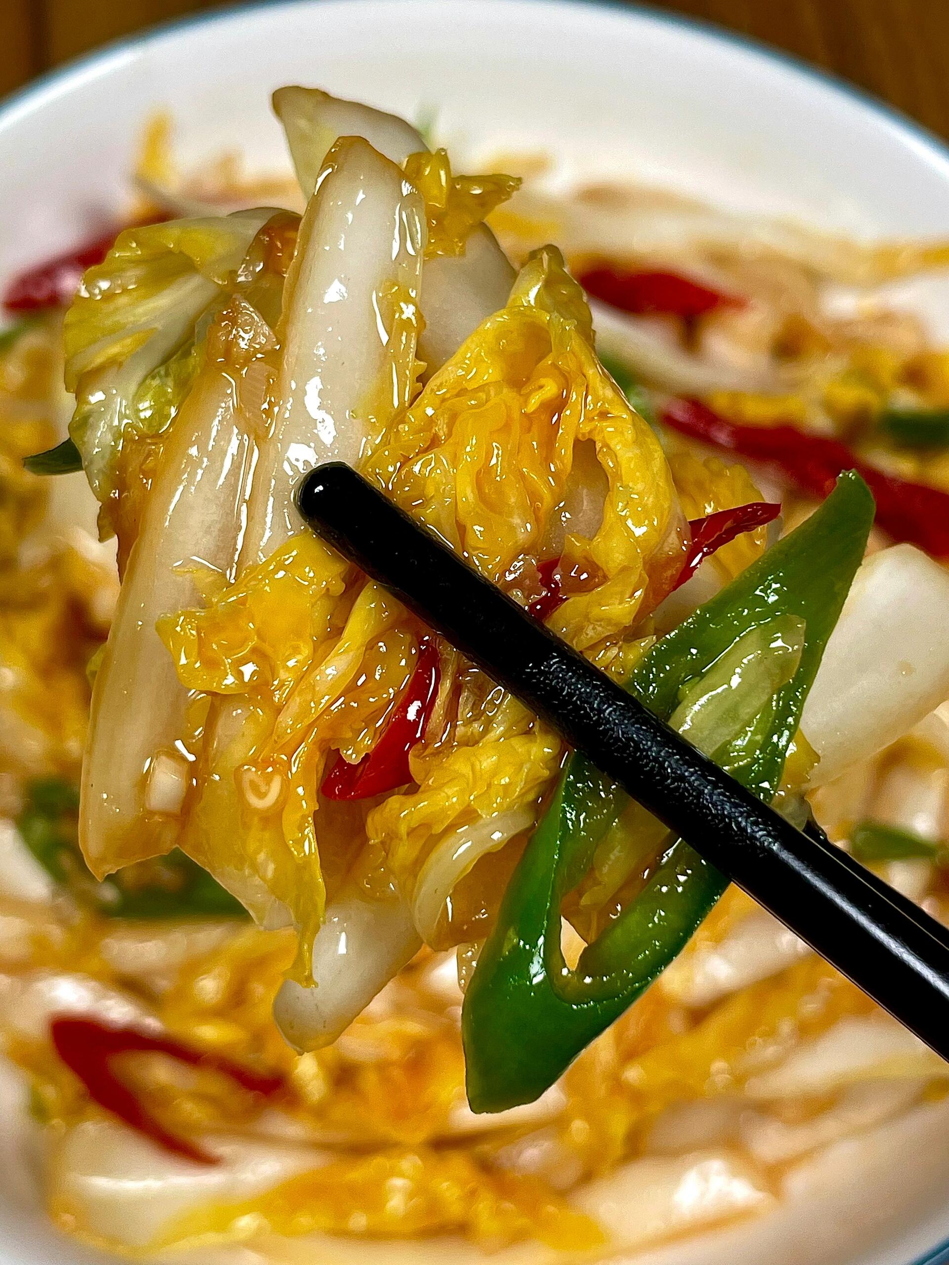 最妙的是配米饭。舀一勺酸辣娃娃菜连汤带菜盖在米饭上,拌匀了吃。米饭的热气把酸辣味烘得更香,每一粒米都裹上了汤汁,扒进嘴里,满足得说不出话。不知不觉,一碗米饭就见了底,还得再去盛第二碗。