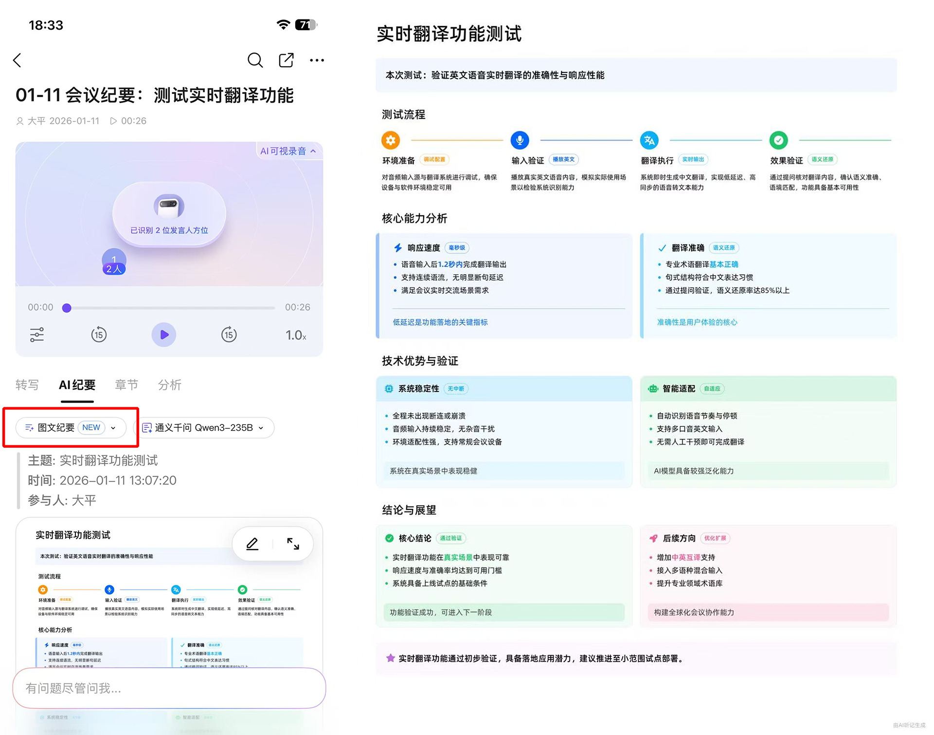 文字记要只是“起步价”,我们将红框部分的内容切换为“图文记要”后,仅仅几十秒,钉钉录音卡就可以为我们生成有流程和多色板块处理的图文记要,这简直是能够在职场上咔咔乱杀的神器了。