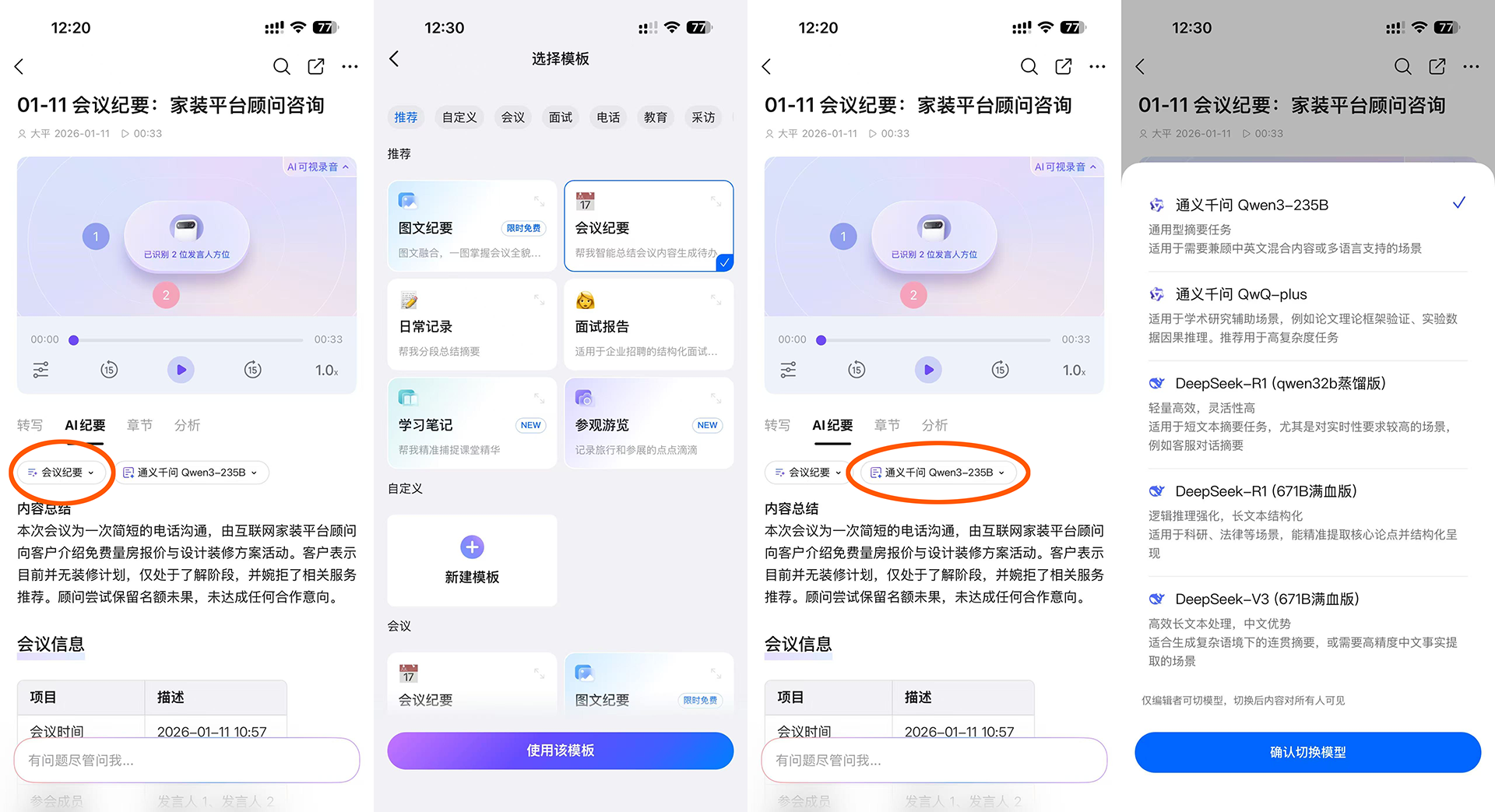 特别是在AI纪要的项目中,我们点击“会议纪要”和“通义千问Qwen3-235B”后,还有更多的模板进行切换,或者是选用其它的语言大模型进行分析。