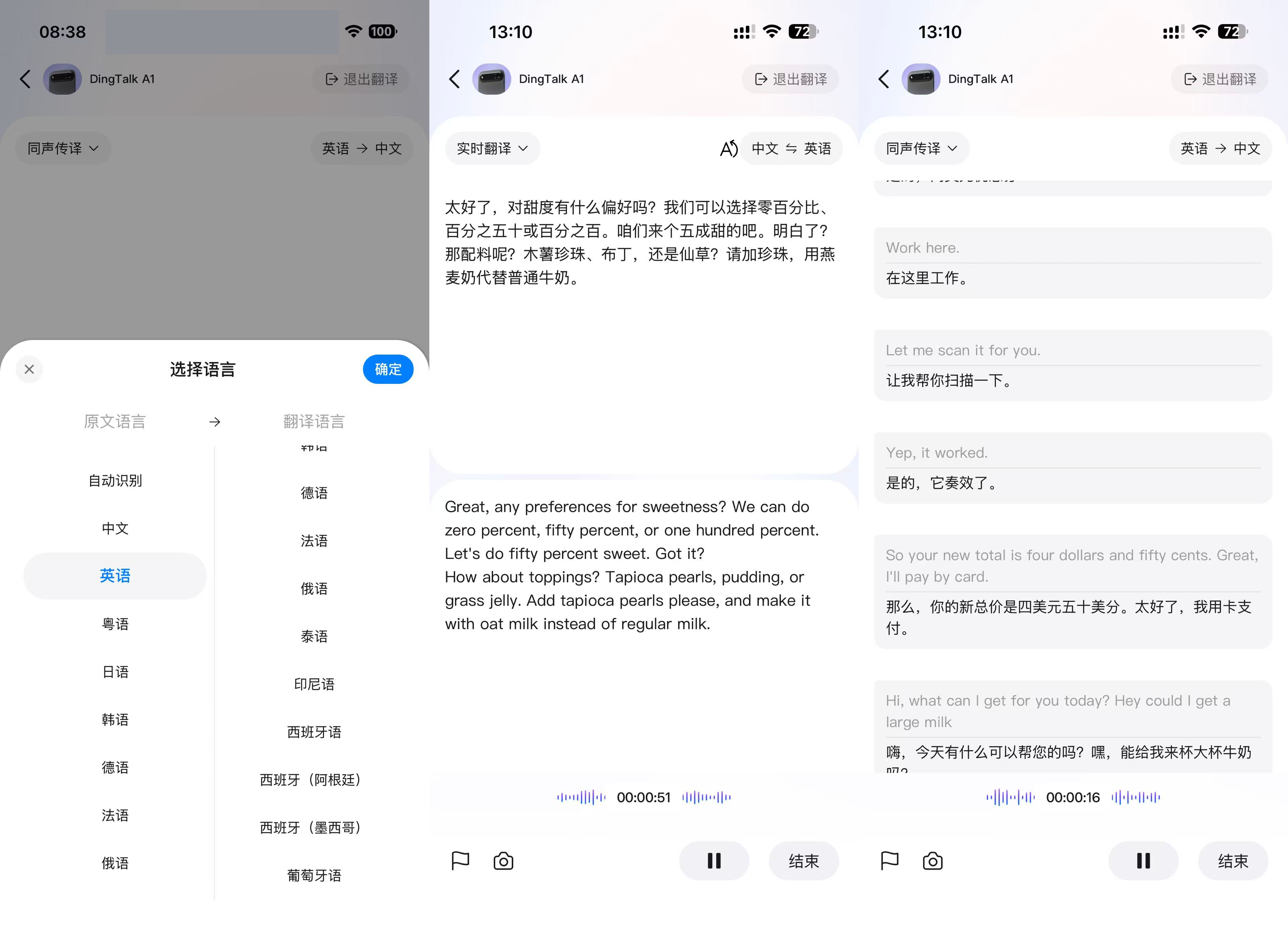 钉钉录音卡支持多语言识别,可以实现21种语言的翻译和120多种语言的转写。它分为了同声传译和实时翻译。其中,同声传译可以识别出讲话人,分段落进行翻译。我们实测了一下中英、英中翻译,翻译的还是非常精准的。