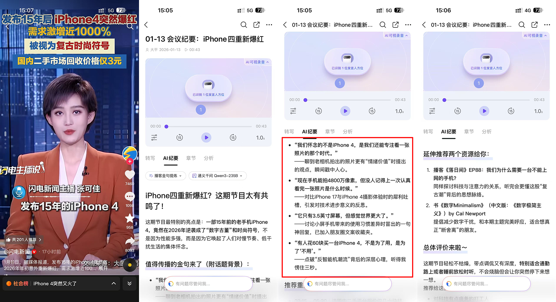 除了电话录音和会议记录之外,作为自媒体博主,我们还非常喜欢在刷抖音的时候,随时把热门视频的文案录制下来,通过“播客金句提炼”的模板,来让我们看到高流量文案中的闪光点。比如说,iPhone4再次翻红中,它就帮我们总结出了如上金句,并分析了它打动人背后的原因,推荐了延伸的资源,这对于喜欢自媒体的友友们来说,确实有着很强的助推能力。