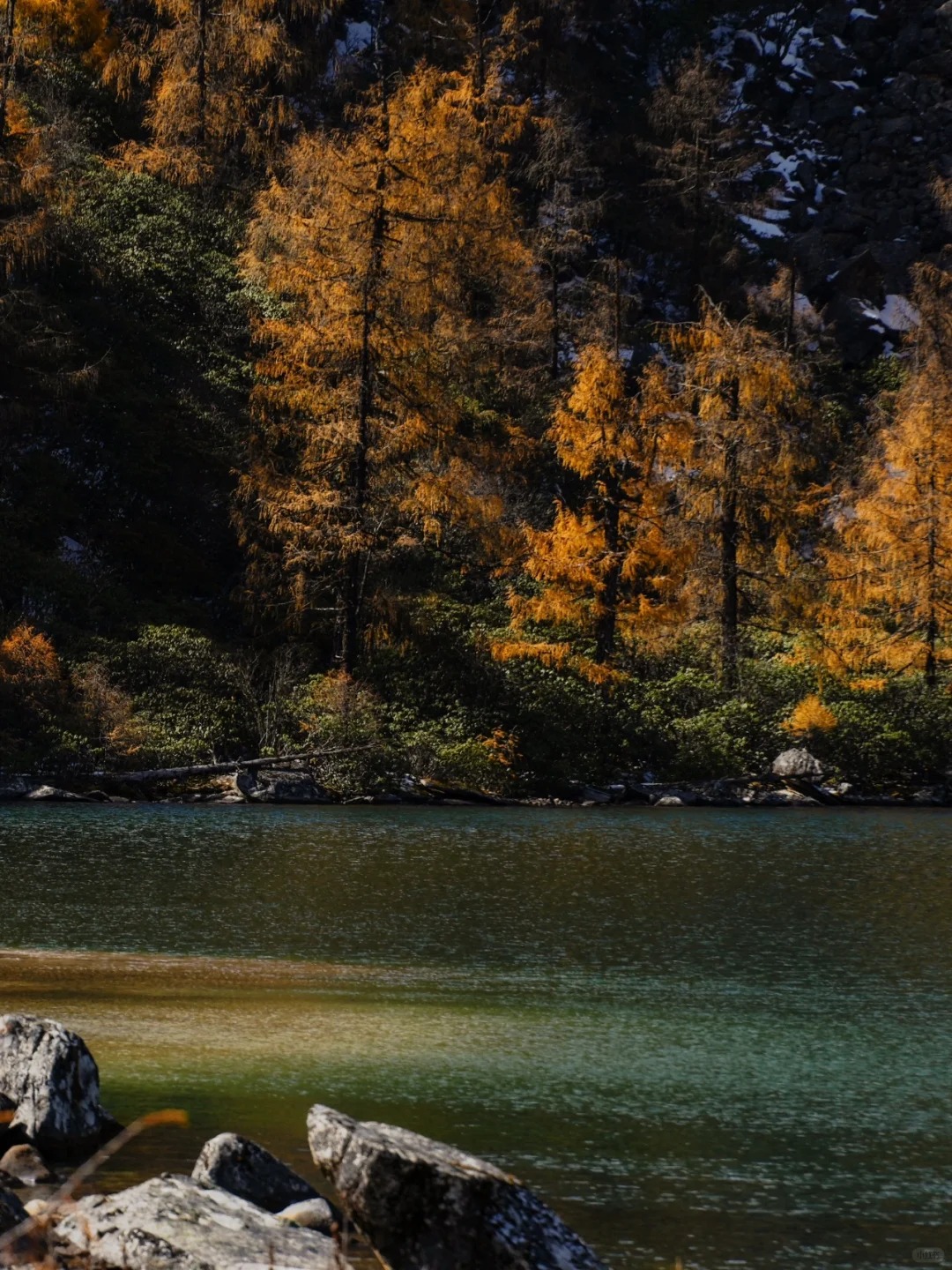 甲依拉措碧蓝的湖泊再加上秋日的黄叶,两个高饱和度的结合应该是甲依拉措蕞美的时刻,漫山遍野的金黄,覆盖皑皑白雪的雪山,如同绿松石般嵌入山谷的湖泊。在这能满足你对秋天的所有幻想!