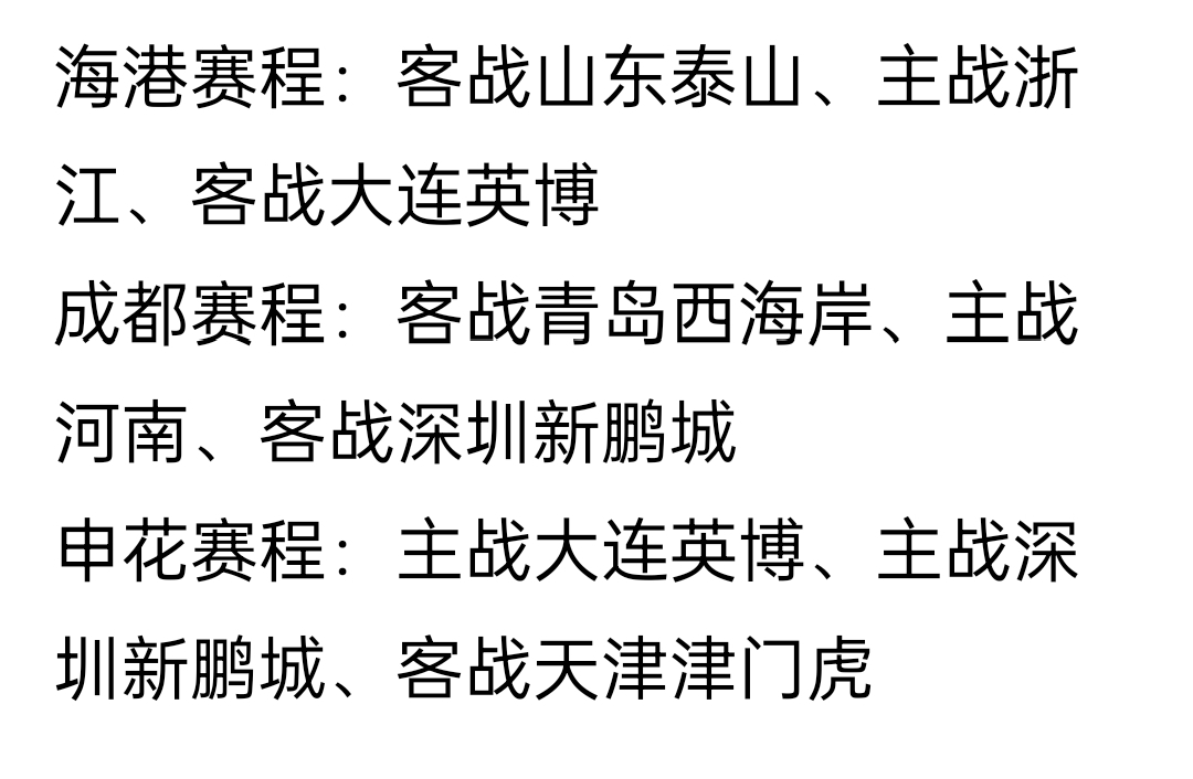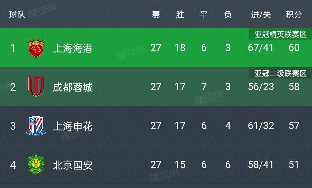 3队争冠,赛程迥异积分榜前三名不变,上海海港积60分排名榜首,成都蓉城积58分紧随其后,上海申花积57分,排名第三,目前来看争冠形势还是不明朗,因为前三的队伍也就是一场球的差距。