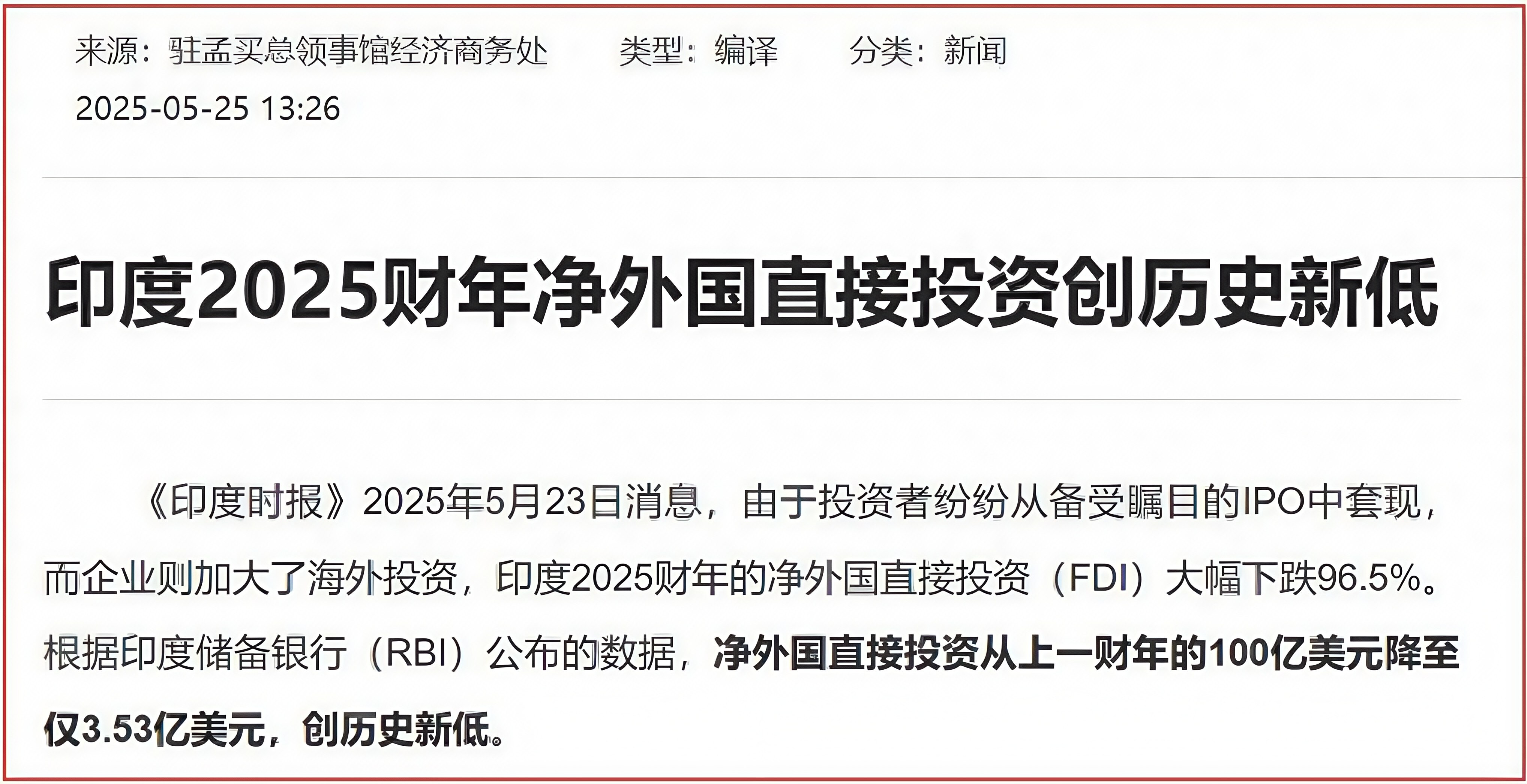 实际上,《印度时报》的数据显示,2024到2025财年中,印度的净外国直接投资金额只有3.53亿美元,大幅下降96.5%,创历史新低。印度维持外国投资都已经很困难了,也不知道阿纳布哪来的底气说2030年的印度会是全球企业争宠的市场。