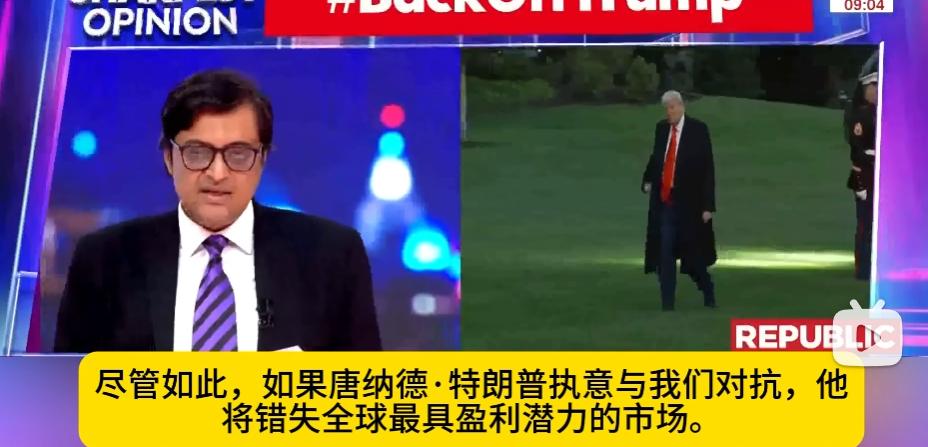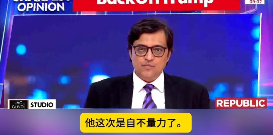 除了社媒上的印度网民在疯狂输出外,印度国内的媒体也火力全开。其中广受印度人喜爱的印度主持人阿纳布·戈斯瓦米,更是在节目中直接喊话特朗普,并直抒胸臆对其表达了“建设性”的看法。