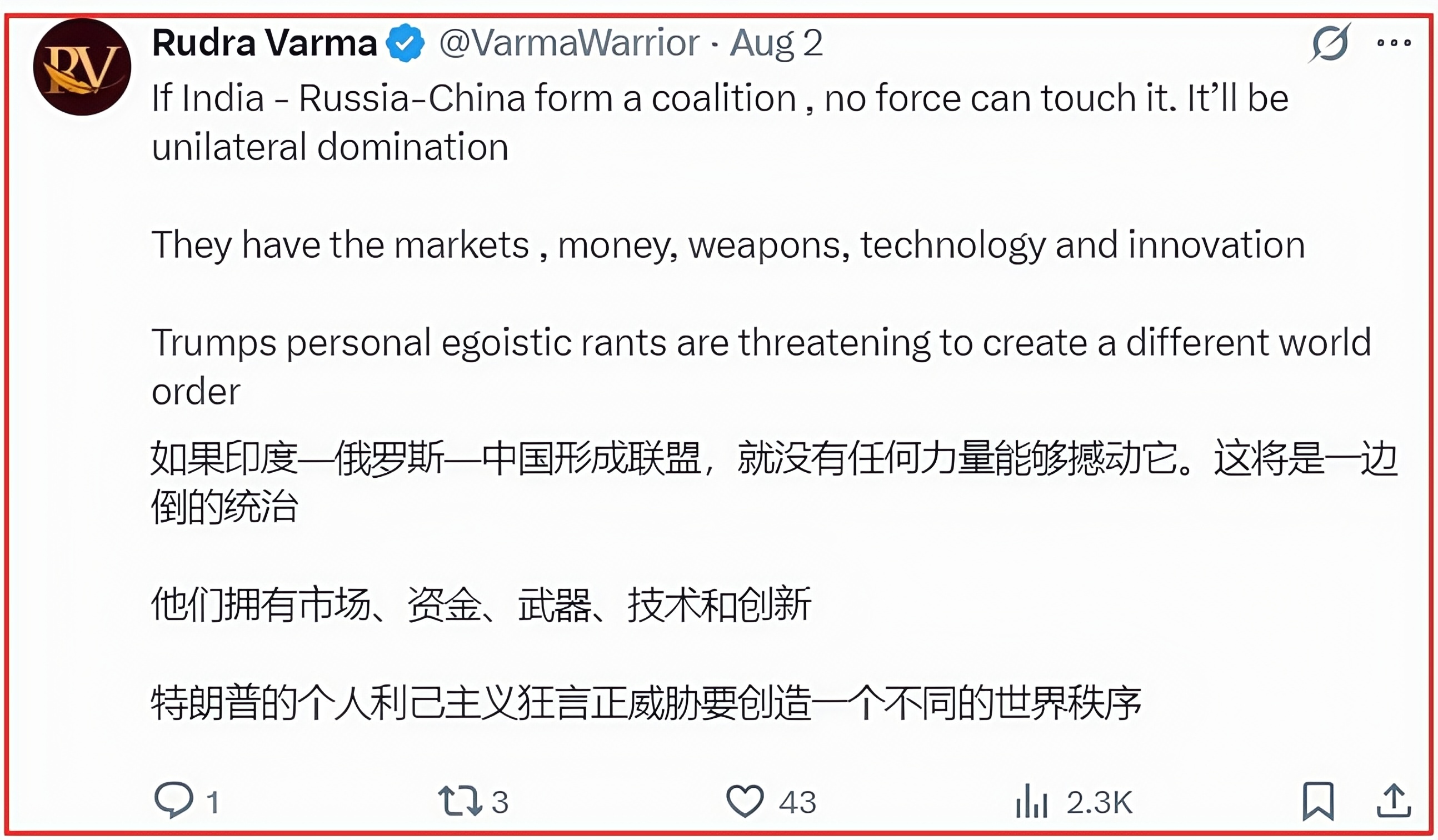 还有印度人表示:“如果印度、俄罗斯和中国能形成联盟,就没有任何力量能撼动它,这将是一边倒的统治。”