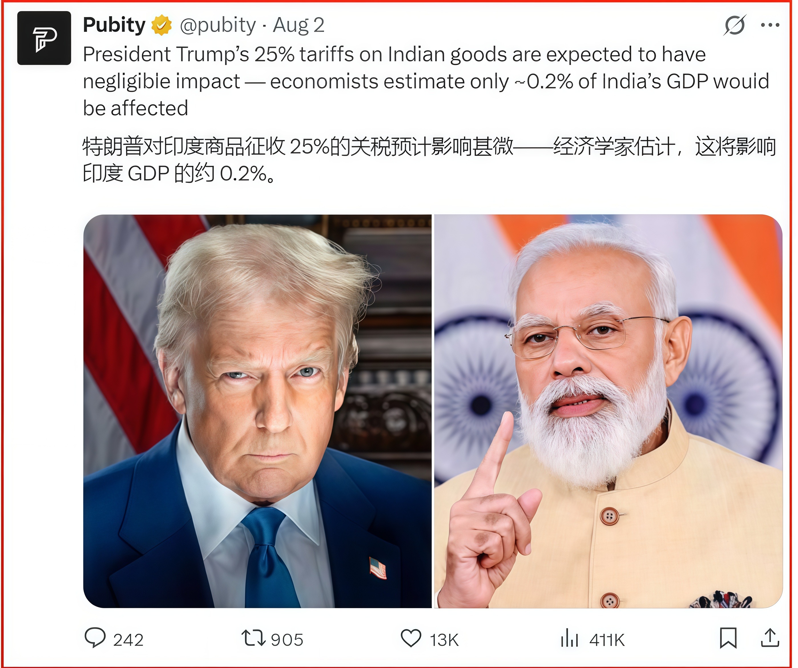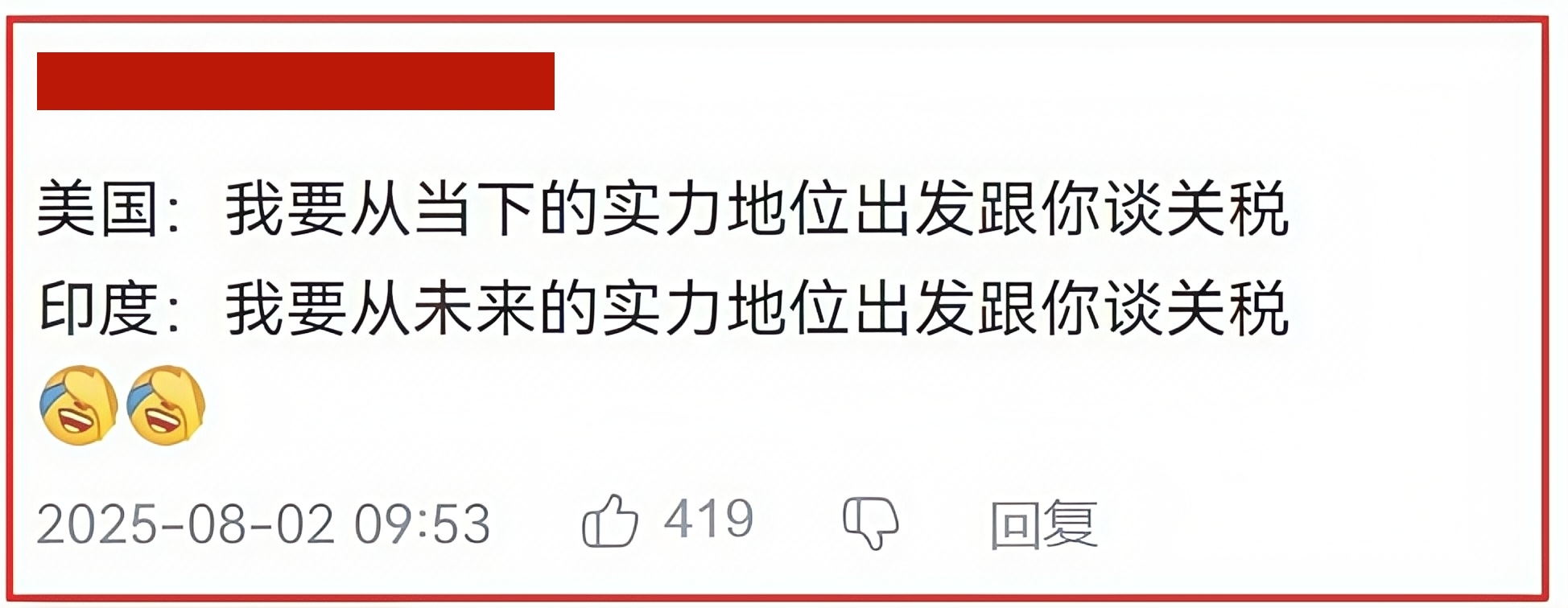 有印度网民表示:根据印度经济学家的预测,美国施加的25%关税,对印度经济的影响只占印度GDP的0.2%,效果微乎其微。