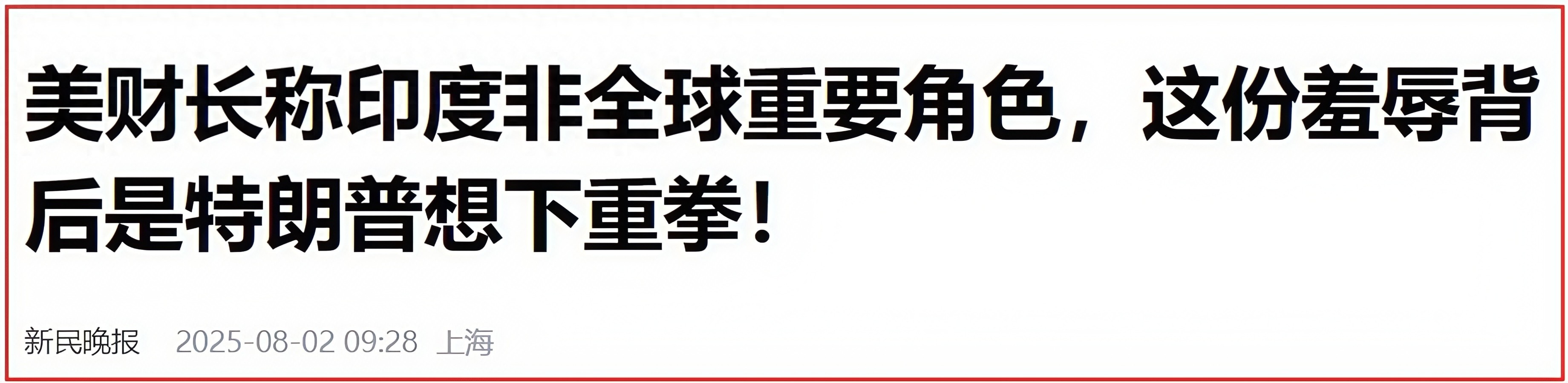 这段时间,特朗普频繁敲打印度:不但对印度施加25%的关税,还要对印度购买俄罗斯能源实施“二级制裁”,更是在公开场合称“印度经济死气沉沉”,并三番五次说印巴停火是因为自己的功劳。美财长贝森特甚至在电视节目中表示:“印度在全球贸易圈中根本不重要”。