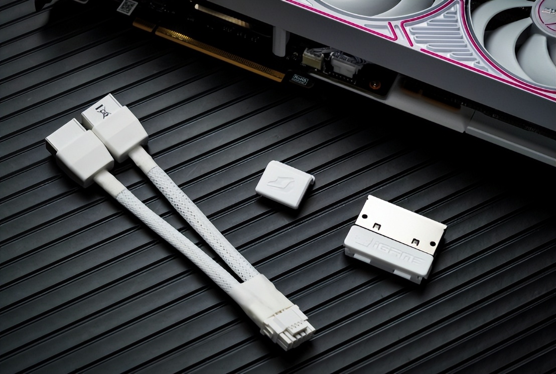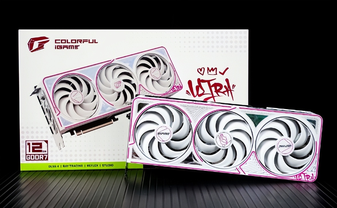 外观与设计层面,这款显卡延续了iGame Ultra系列的嘻哈艺术风格,包装以白色为基底,搭配淡粉色网点装饰与涂鸦风“Ultra”标识,辨识度拉满。核心配件除常规双8pin转16pin供电线外,新增PCB供电连接组件,且所有配件均采用白色设计,保障上机视觉统一性。显卡本体尺寸为300.5×120×50mm(不含挡板),2.5槽厚度符合NVIDIA SFF-Ready标准,适配多数中塔机箱。整流罩以纯白为底,辅以桃粉珠光渐变,光线变化下呈现柔和光影过渡,相较于传统镭射渐变更显细腻。三把90mm环形加固风扇搭配9片扇叶设计,既降低风噪,又与装甲律动线条呼应,传递出潮流动感的设计语言。
