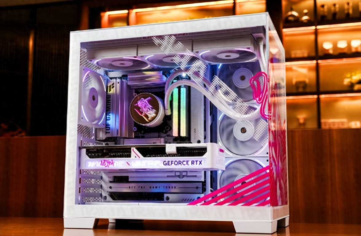 背插供电是本次设计的核心革新。显卡保留传统单16pin(12+4)辅助供电接口,兼容传统装机方案;在金手指侧则预留了凹进PCB的二次供电接口,接入附赠的连接组件并取下保护壳后,即可呈现与PCIE槽齐平的PCB供电模块。背部高强度嘻哈风格背板,除提供防护与辅助散热外,纯白底色搭配桃粉“ULTRA”涂鸦字体强化设计风格,侧面大面积镂空则优化风道流通。上机后若采用背插方案,可通过专用保护盖遮蔽传统16pin接口,彻底消除正面线材干扰,实现“无线材”视觉效果。