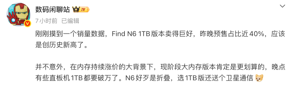 OPPO Find N6的1TB版本爆火,在当下来说其实藏着精明的消费智慧,在当前行业变局下,用户选择用真金白银投出的“价值票”,它反映出用户对产品生命周期成本的重新考量——在内存涨价成为常态的今天,一次性投资大存储,反而是更经济、更面向未来的选择。