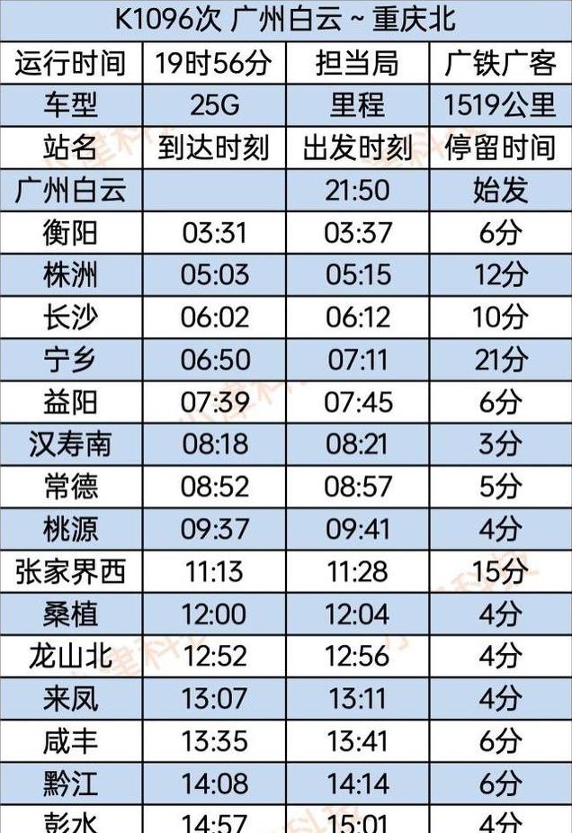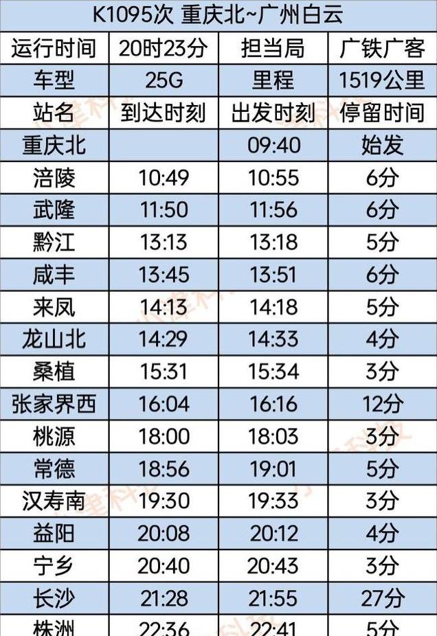 问渠哪得清如许?为有源头活水来!首先啊,我们得搞清楚这趟火车的基本情况。它就是K1095比1096次列车,全程1519公里,从广州白云站一路向北,途经湖南长沙和张家界,最终抵达重庆北站。反过来,K1096次就是从重庆出发往广州走的。不过可别小瞧了它,虽然没高铁那么贵妃火辣,但它一路风光,每天都有好多旅客乘坐,可谓是老朽龙钟。