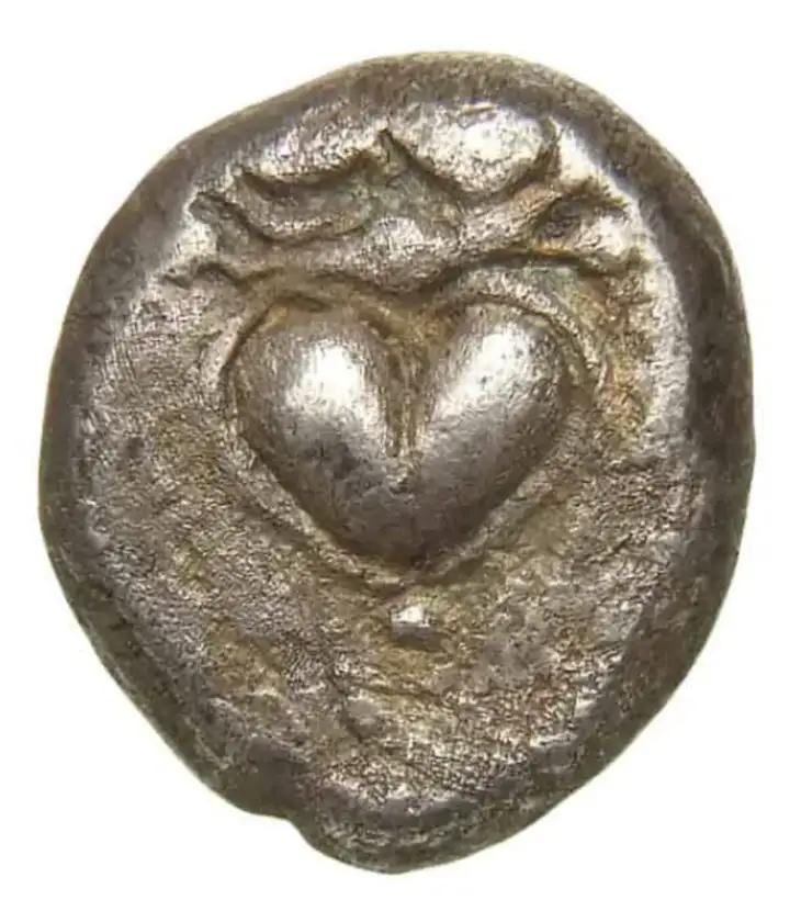 上面这个是古城基勒奈(公元前600年)出土的钱币,它上面标就有一个爱心图案,而根据一些记载,这个就是取自罗盘草。