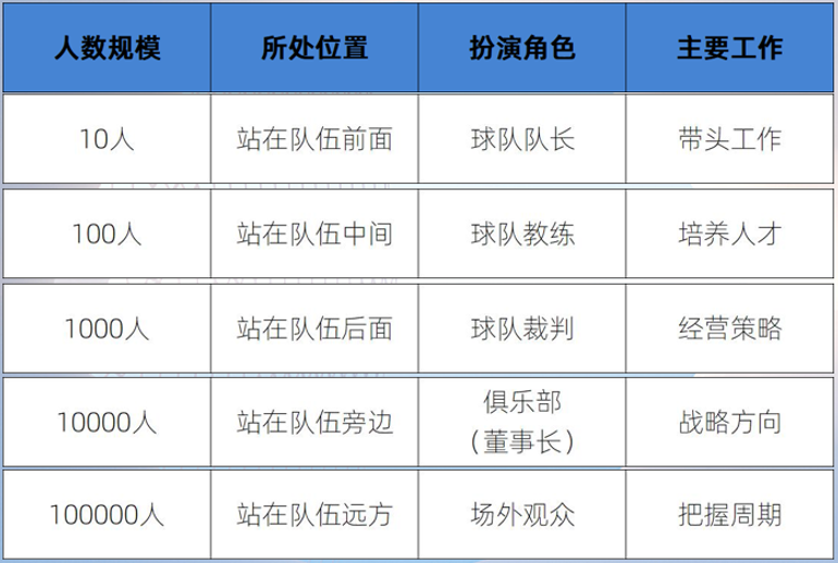 当企业的人数规模达到10000人,老板要站在队伍的旁边,角色是俱乐部的董事长,你要看着队伍走,所以此时你的主要工作是制定战略方向。