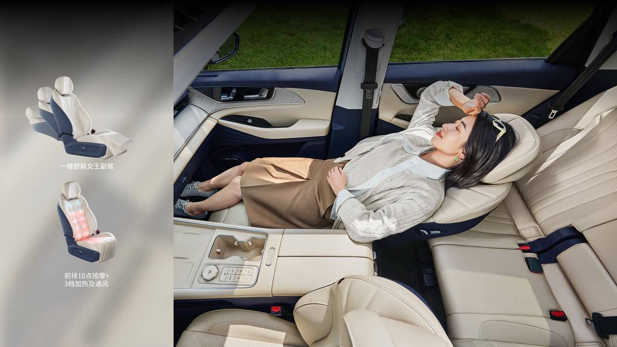 车内的舒适配置更是精准击中用户需求。主驾电动6向调节搭配4向腰托,10点气袋按摩功能加上三档加热与通风,让长途驾驶也能时刻舒展;女王副驾一键舒躺后,坐垫腿托最大开启角度可达128°,真正实现SPA级舒适体验。3Dmesh麂皮绒包覆与TOM雅致木纹饰板质感十足,加上SONY殿堂级14扬环绕音响,让每一段路程都像置身移动音乐厅。